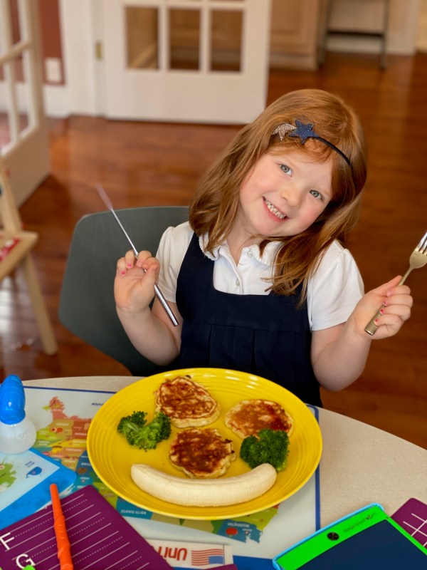 I'm dressed up in Liza's old uniform and my NBS headband to celebrate my new school where I'll be going for kindergarten in the fall. Mom made me the best lunch today and it's healthy. I'm eating cottage cheese pancakes with a little bit of raspberry jam and broccoli. (Mom likes green on the plate!)... Continue Reading →