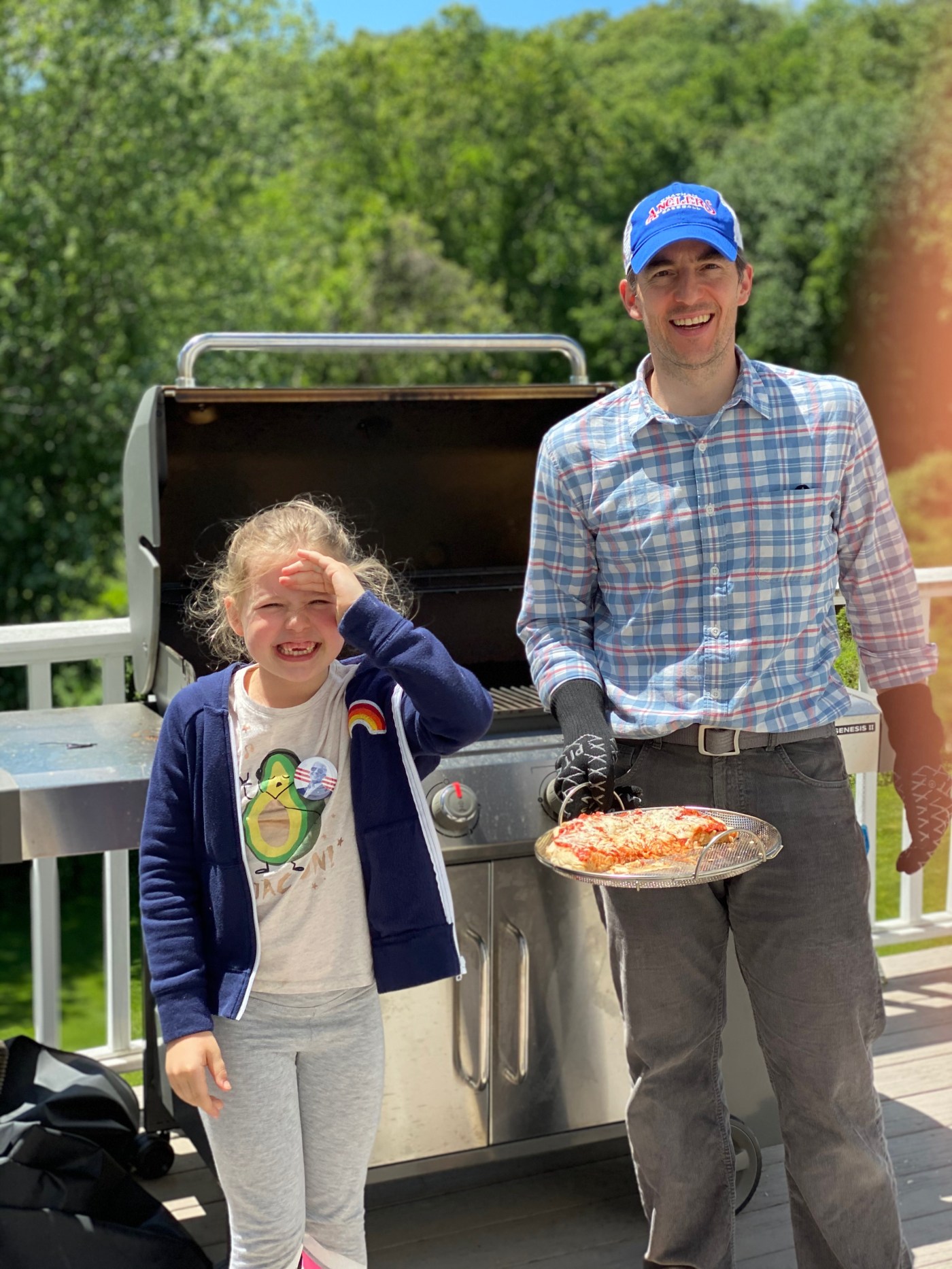 We wanted a little more than scrambled eggs for brunch today and came up with the idea of making pizza on the grill. No stone necessary! The secret is to grill the raw dough first, then add the topping–we used Marinara sauce and mozarellla–and then grill it again. Of course it helps to have a helper like Liza. Annie, who cheered them on, said the pizza was “delicious. Really great.”