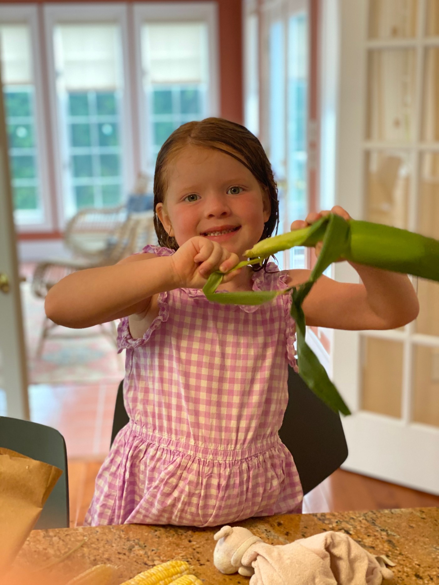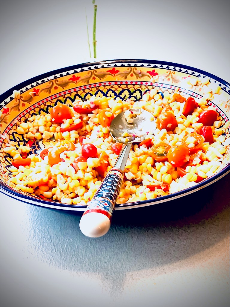 We like to go to The Maple Bank food stand in Roxbury, Connecticut for vegetables in summer. Starting about now you can get corn for one of our favorite dishes, corn salad. Here is Annie shucking the ears. After we’ve boiled the ears and they’ve cooled, Liza cuts off the kernels. This time we used the recipe from Barefoot Contessa (https://barefootcontessa.com/recipes/fresh-corn-salad) and added some sweet local cherry tomatoes.