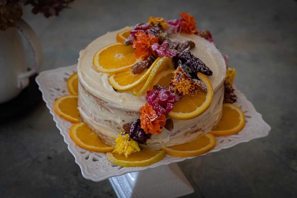 Place a cake layer on the plate and brush it with 2 tablespoons of the syrup. Cover the cake with some of the frosting. Repeat this process with the remaining 2 layers remembering to brush each layer with the syrup before frosting. Frost the sides of the cakes. Decorate the cake with orange slices and whole almonds. Edible flowers add an elegant touch if available!