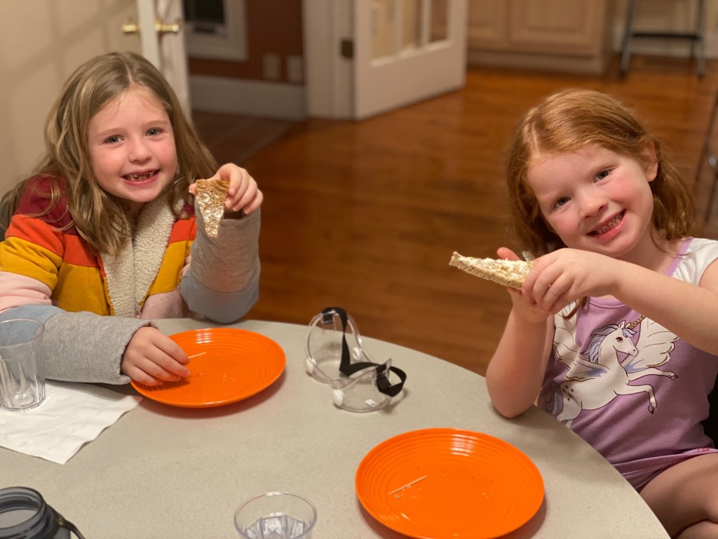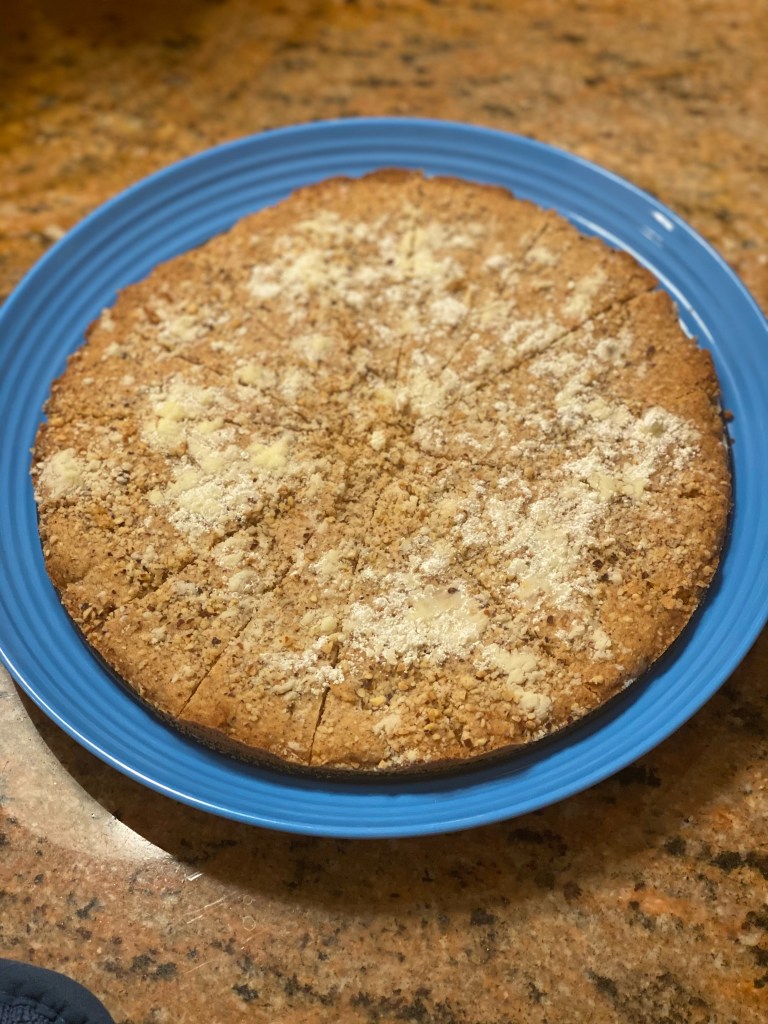 I especially like to bake on weekends. Last Friday night Mom and I found a recipe for a shortbread with nuts that looked good. It calls for pistachios but we substituted hazelnuts so we wouldn’t have to do all that shelling. The dough is made in the Cuisinart, which I’m now learning to use. You use a round pan to bake them in. Cut them into triangles as soon as they are out of the oven and when they’ve cooled, eat one right away. Make sure to offer one to your sister and your mom and dad.
